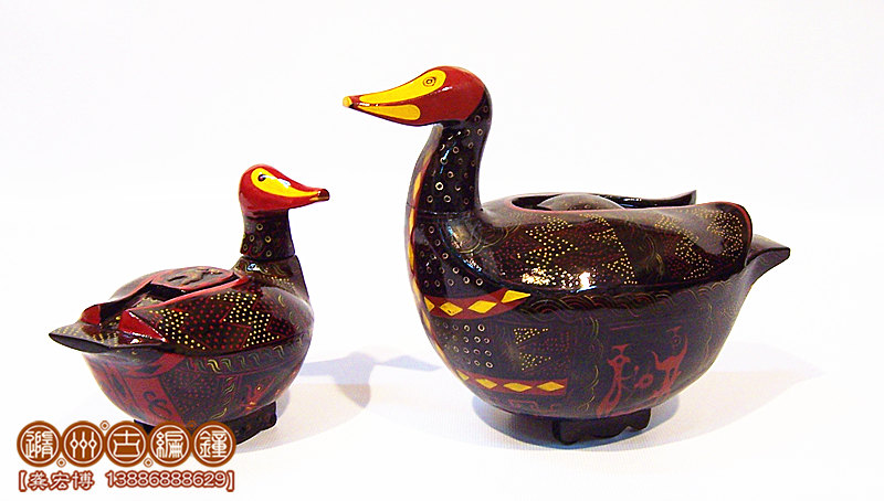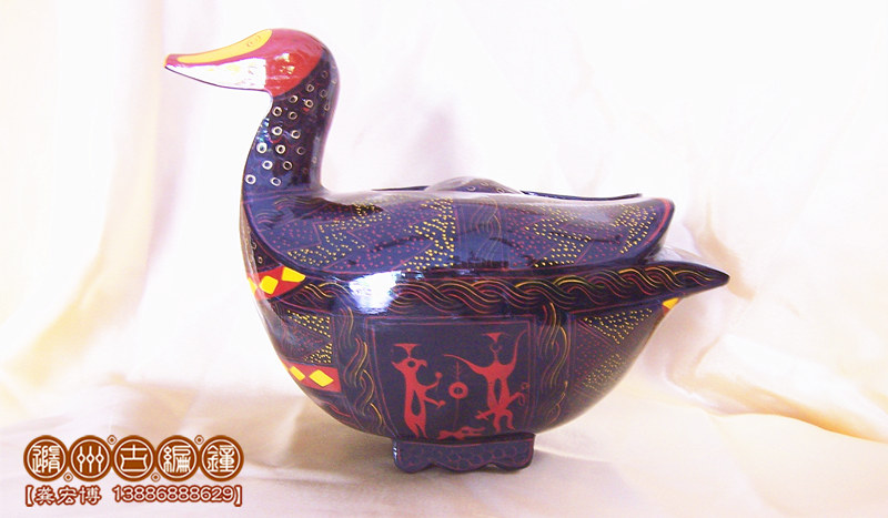 簡介:鴛鴦盒為木胎其身,體分兩半,制作再粘合成,頭頸與身體則榫卯相連,故頭能自由轉動。背上有一長方形口與蓋相扣合,蓋上浮雕龍紋。整器外髹黑漆,其上用紅色和金色描繪眼、嘴、羽毛以及菱形紋等。在它的腹部還描繪了建鼓舞和撞鐘擊磬的情節(jié)畫。