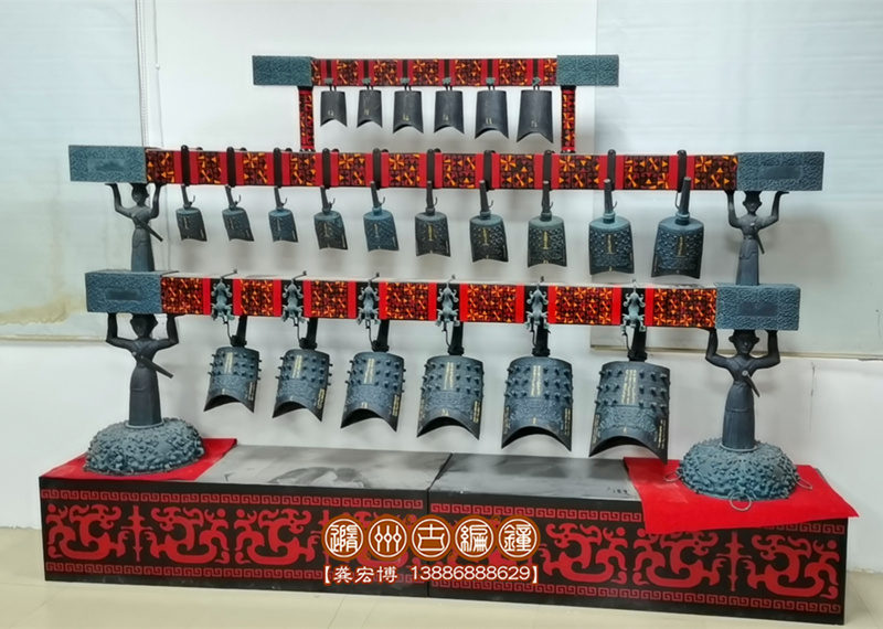 編鐘全部為錫青銅鑄造而成,采用國際標(biāo)準(zhǔn)樂音音高A=440Hz調(diào)音,可以旋宮轉(zhuǎn)調(diào)演奏古今中外樂曲,編鐘大梁采用優(yōu)質(zhì)實(shí)木板制作,表面噴漆,彩繪花紋;另配有保管編鐘用的木箱,便于運(yùn)輸和儲(chǔ)存。編鐘底部可以安裝滑輪系統(tǒng),在舞臺(tái)上方便移動(dòng),2人配合可輕松迅速移動(dòng)到舞臺(tái)合適的位置。