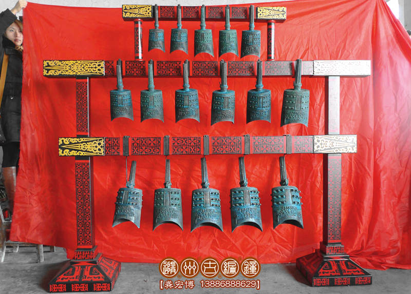 16件套系編鐘規(guī)格:長(zhǎng)2米×寬0.4米×高1.8米,編鐘為青銅鑄造而成,表面顏色為古銅綠色,編鐘音域3個(gè)八度,從低音5至高音5,最大口徑25厘米,最小9.5厘米。
