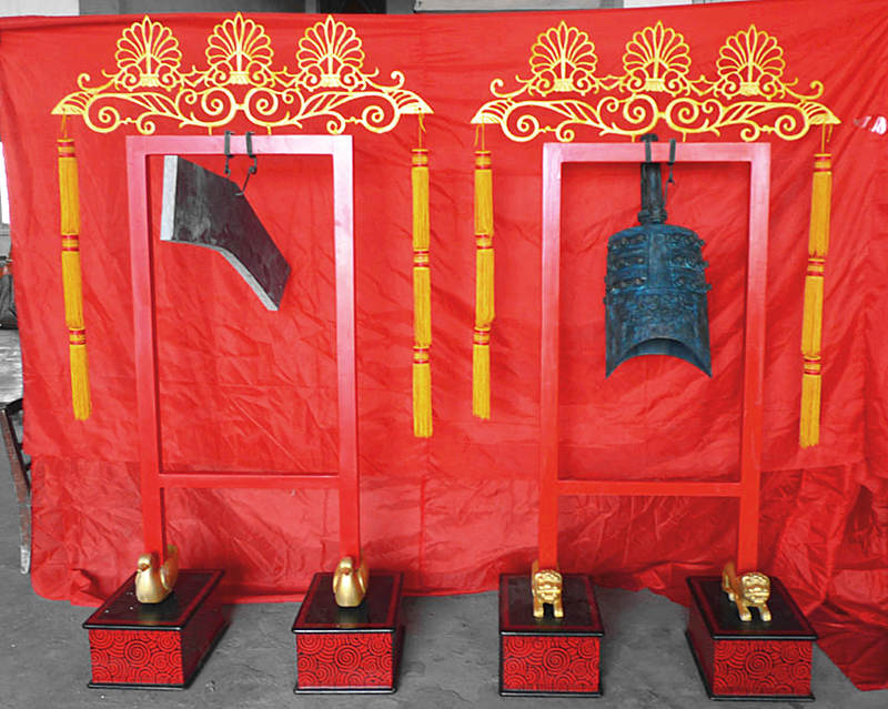 3、特鐘規(guī)格:長(zhǎng)0.9米×寬0.4米×高1.8米,鐘體口徑35厘米,高75厘米,編鐘為青銅鑄造而成,表面顏色為古銅綠色。