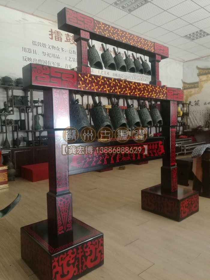 上??蛻舳ㄖ频?2件編鐘長2米、高2米、寬0.55米,分兩層懸掛了12件青銅編鐘,每件編鐘均可發(fā)出2個不同的樂音,半音齊備,采用A=440Hz標準調(diào)音,適合小型民樂團體使用,豐富了民樂團的整體音樂效果,從而獲得客戶的一致好評。